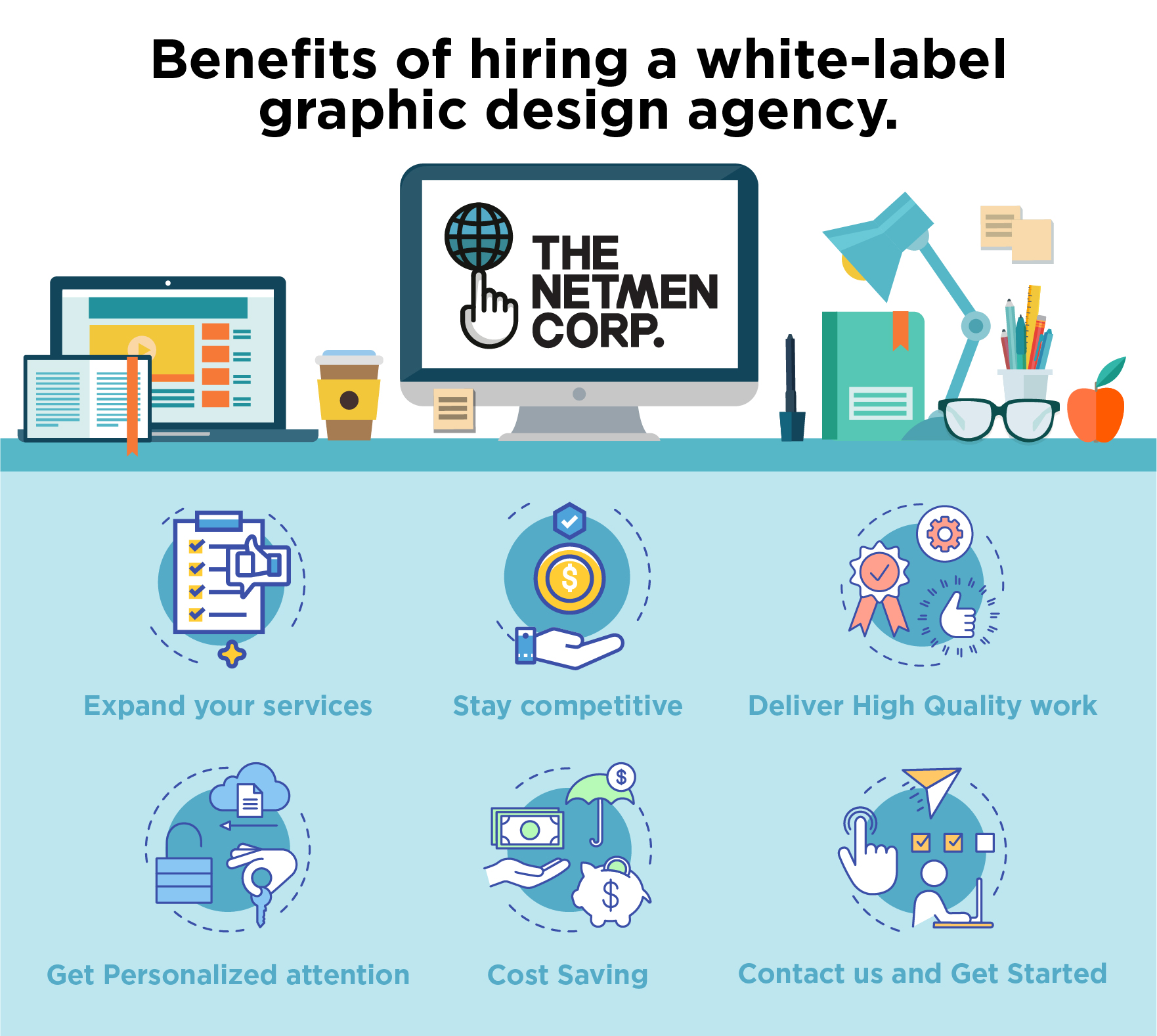 The NetMenCorp offers white-label services and you’ll get all the benefits I previously mentioned. And the best part is that you can get our services, the expertise and professionalism of our design team, and an account manager who will understand your goals, drivers, and needs and who will be always ready to go the extra mile.